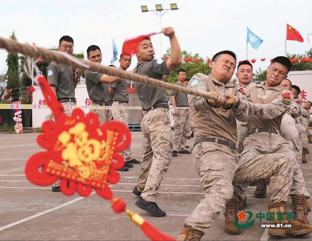 中国第12批赴南苏丹(朱巴)维和步兵营官兵,在春节期间开展多种活动丰富节日生活。图为官兵举行拔河比赛。