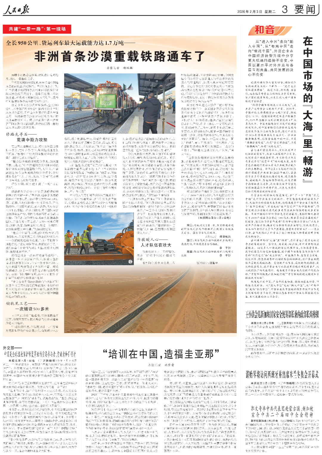 依托硬核技术支撑,项目创下单日铺焊轨4.5公里、预制轨枕5200根的纪录。阿尔及利亚国家铁路局工程师贝勒赫·优素福说:“那段时间,项目部昼夜奋战,设备不停机、人员轮班作业,始终保持着有序高效的施工节奏。”在他看来,高效施工的核心并非单纯增派人手,而在于成熟的技术体系与科学的组织管理。“与中国同事一起工作,我们不仅学到了操作技能,更建立起一套适配极端环境、兼顾效率与安全的重载铁路建设体系,这些经验将深刻影响阿尔及利亚未来铁路项目的建设模式。”贝勒赫·优素福说。