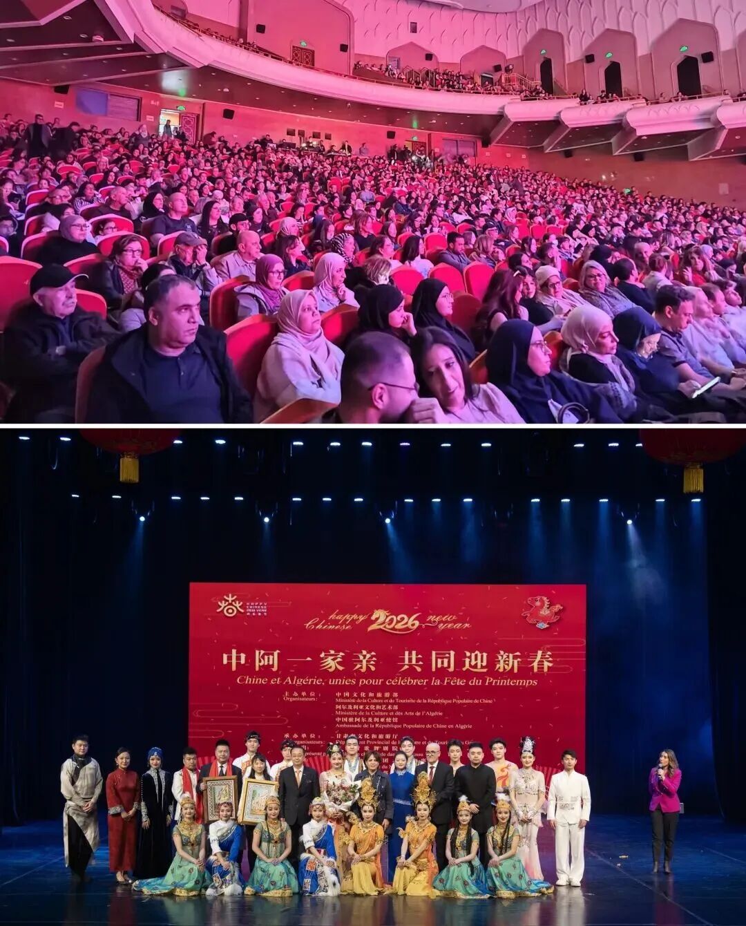 1月28日至29日,由中国文化和旅游部、驻阿尔及利亚使馆、阿文化和艺术部共同主办的2026“阿尔及尔·欢乐春节”两场文艺演出在阿尔及尔歌剧院隆重举行,驻阿尔及利亚大使董广利、阿文化和艺术部长本窦达出席首场演出并致辞。阿各界友好人士、华人华侨、驻阿使节等近3000人共同观看演出。